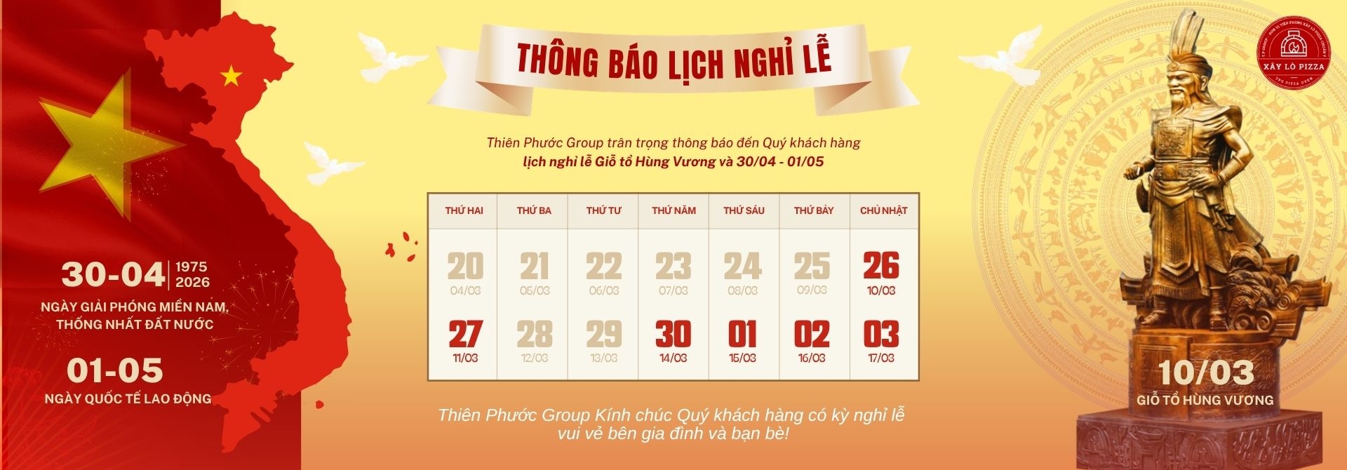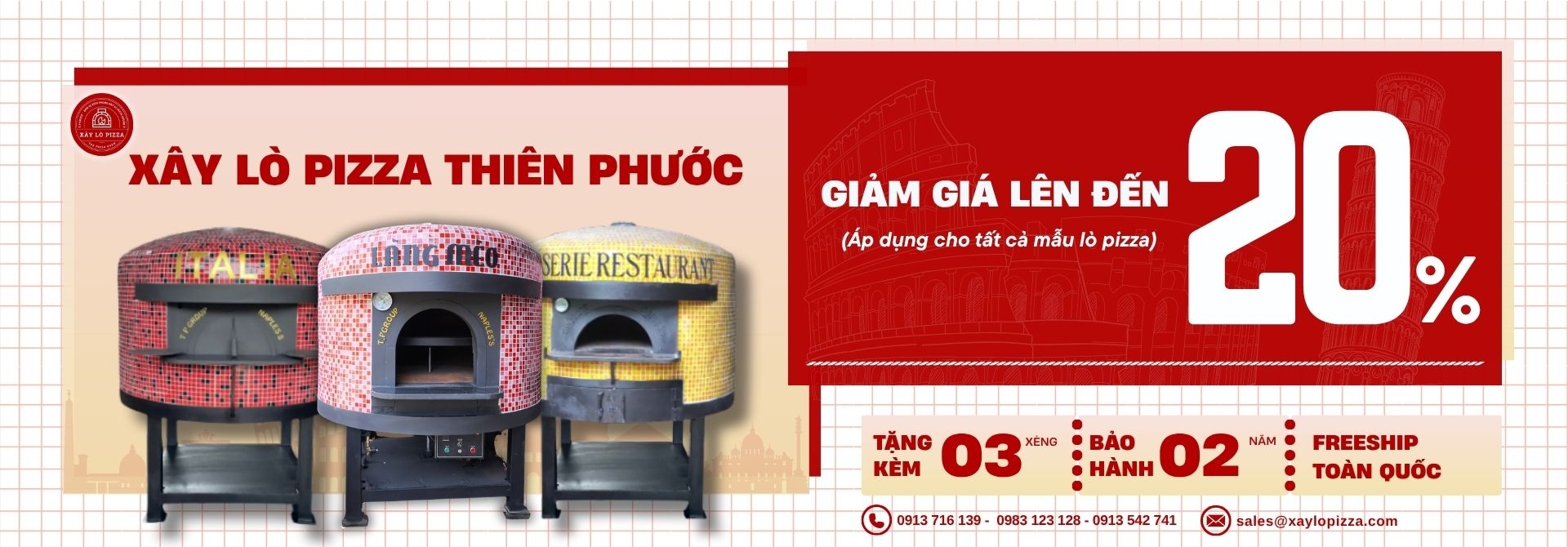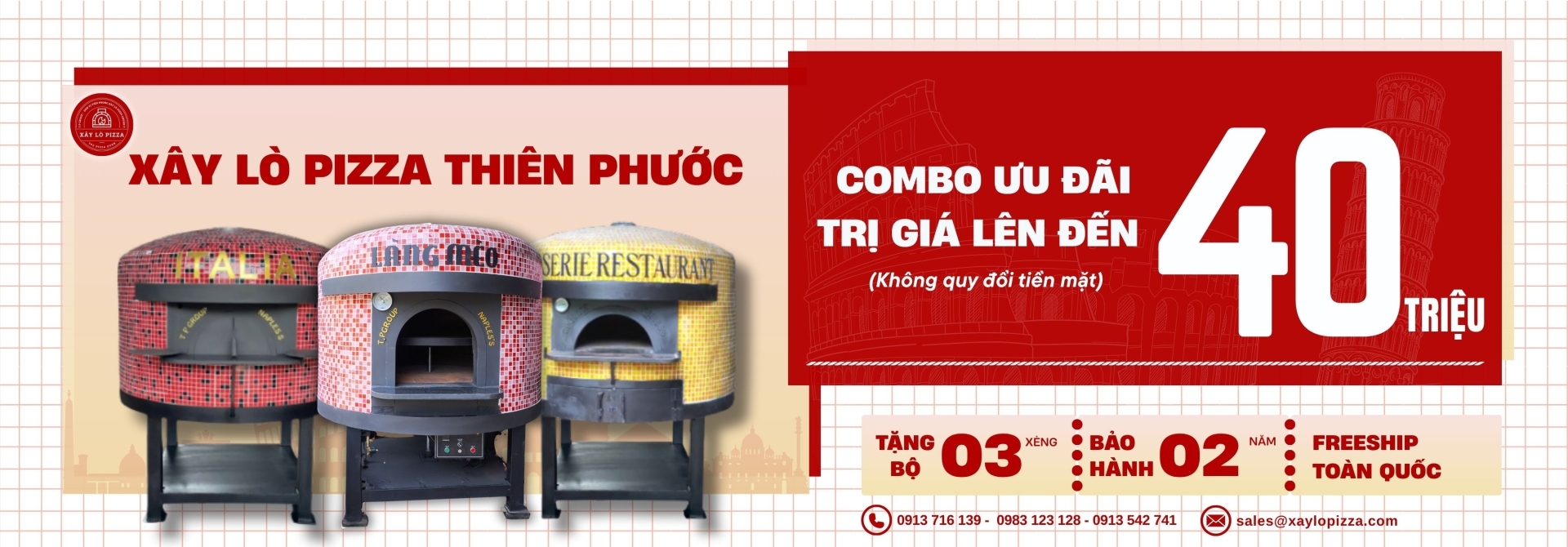 Với hơn 10 năm kinh nghiệm, Xây Lò Pizza Thiên Phước là thương hiệu uy tín tại Việt Nam trong lĩnh vực lò nướng pizza gạch, lò nướng pizza củi, lò nướng pizza gas, lò nướng pizza 2 tầng xoay, lò nướng pizza kết hợp gas và củi, chuẩn phong cách Ý, đồng hành cùng nhiều chuỗi nhà hàng, resort và quán ăn lớn trên toàn quốc.